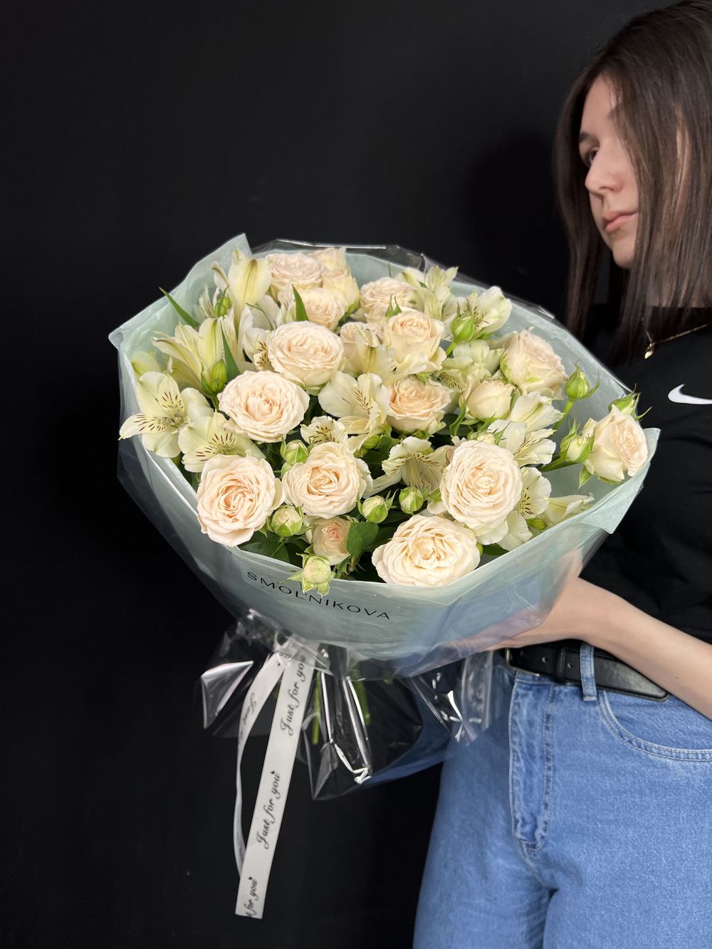 Очаровательный букет из 4 кустовых роз и 5 альстромерий — идеальное сочетание элегантности и нежности. Яркие цветы в гармонии создают атмосферу радости и тепла, делая этот букет прекрасным подарком для любого случая