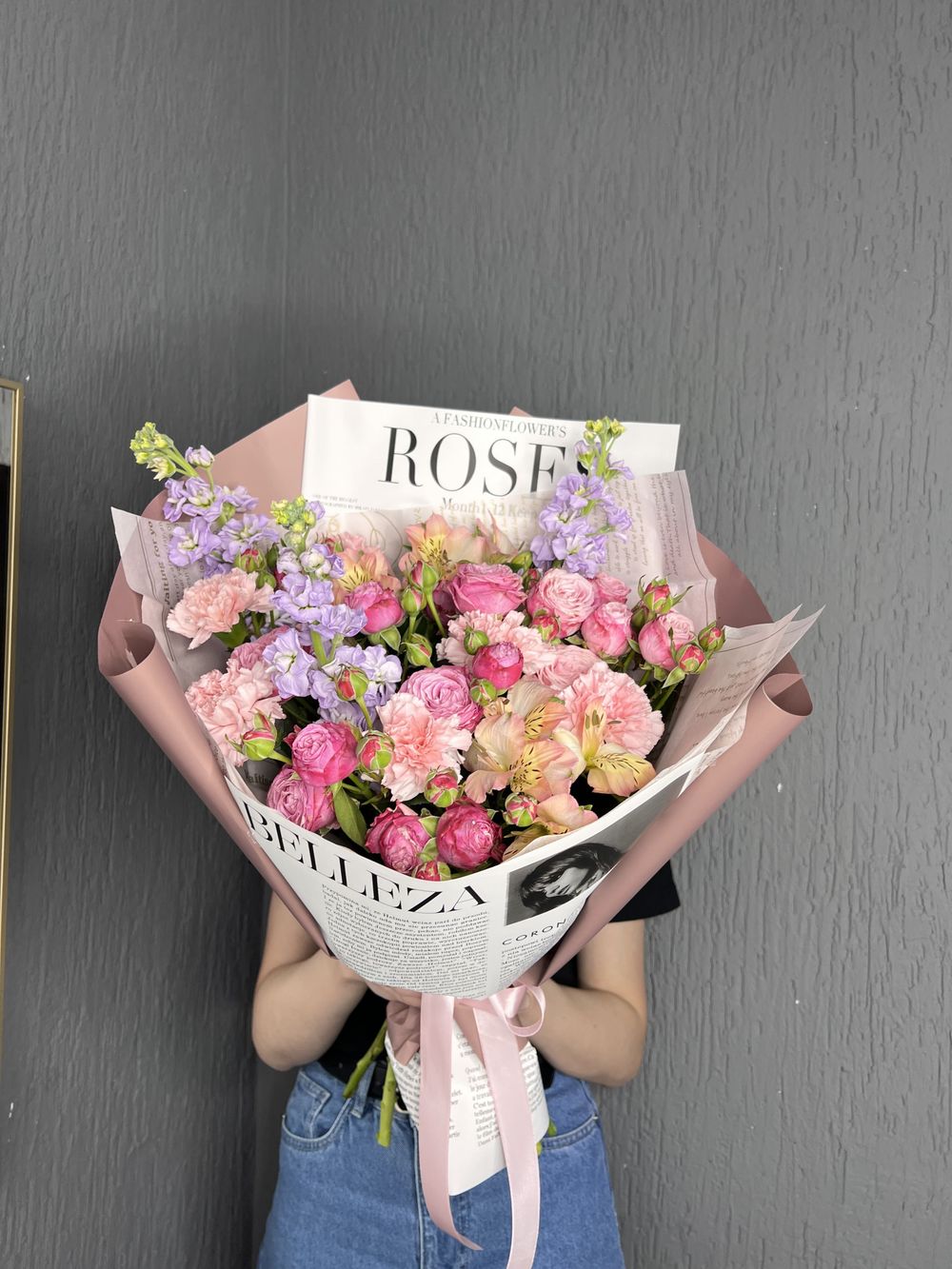 Состав5 диантусы,2 альстромерии,3 премиум розы,3 маттиолы