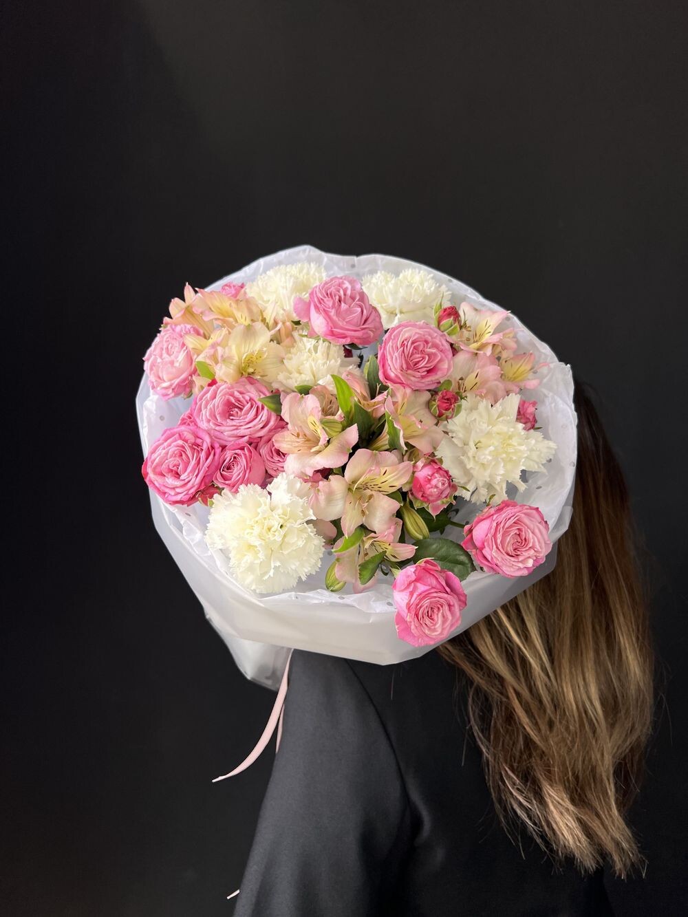 Нежный букет из премиальных роз , альстромерий и диантусов