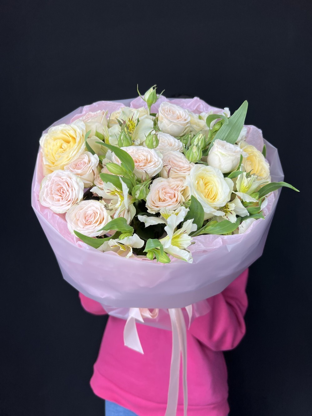 Изысканный букет: 5 классических роз, 4 кустовые розы и 4 альстромерии. Гармония красоты и нежности в каждом цветке.
