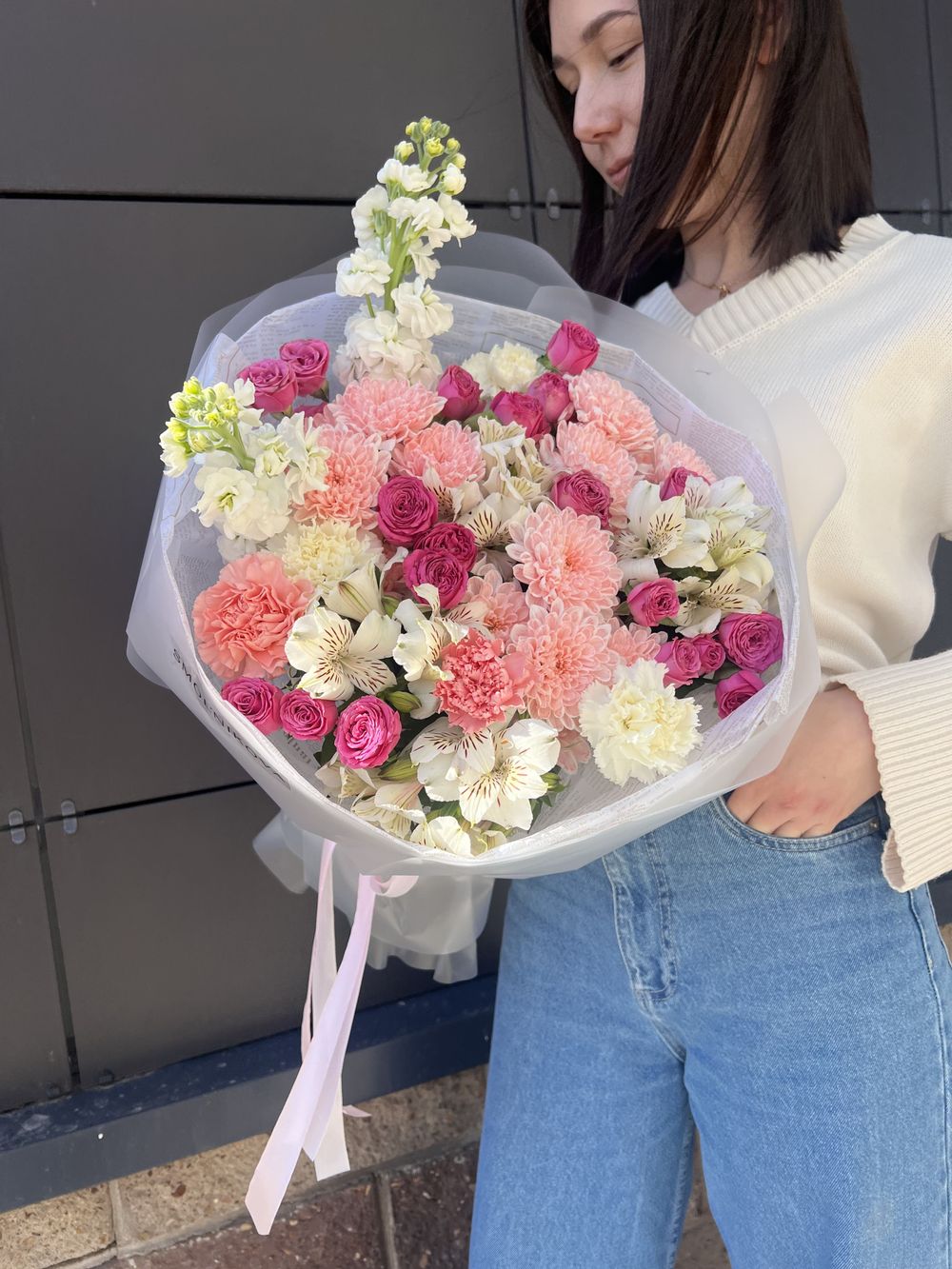 Очаровательный букет: 3 хризантемы, 5 кустовых роз, 2 ароматных маттиолы, 4 яркие альстромерии и нежные диантусы. Идеальный комплимент для самых близких!