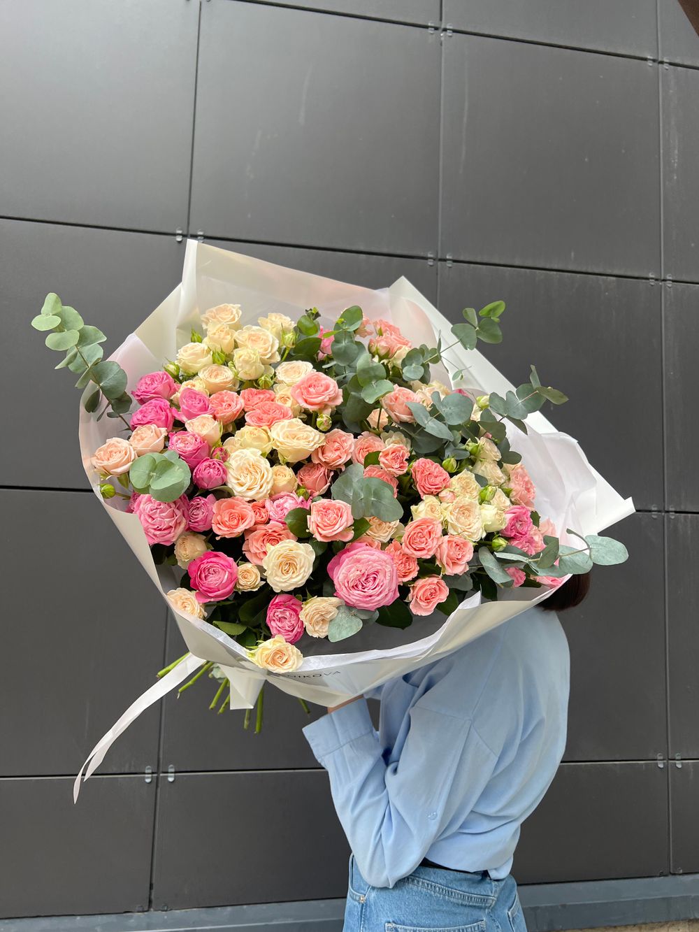 Роскошное облако нежности! Огромный букет из 25 кустовых роз в обрамлении свежего эвкалипта – это воплощение изысканности и элегантности. Подарите незабываемое впечатление и море положительных эмоций!