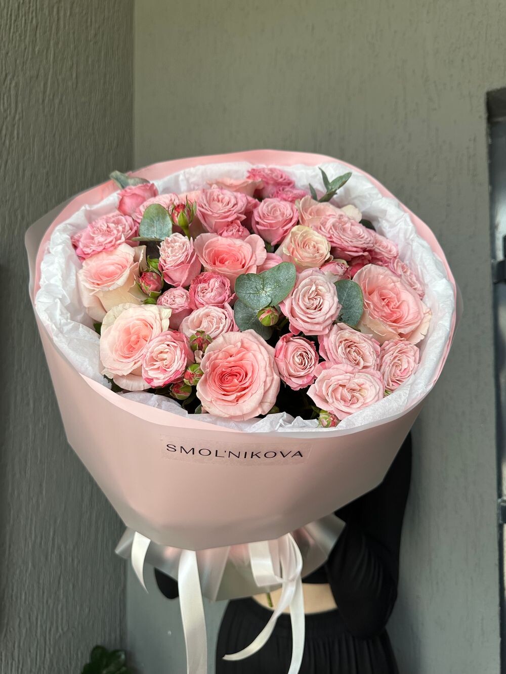 Роскошный букет из 6 кустовых роз и 9 одноголовых роз, дополненный ароматным эвкалиптом. Элегантное сочетание, создающее атмосферу изысканности и романтики. Прекрасный подарок для особого случая!