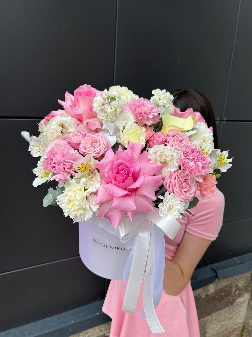 Розовая композиция цветов в шляпной коробке