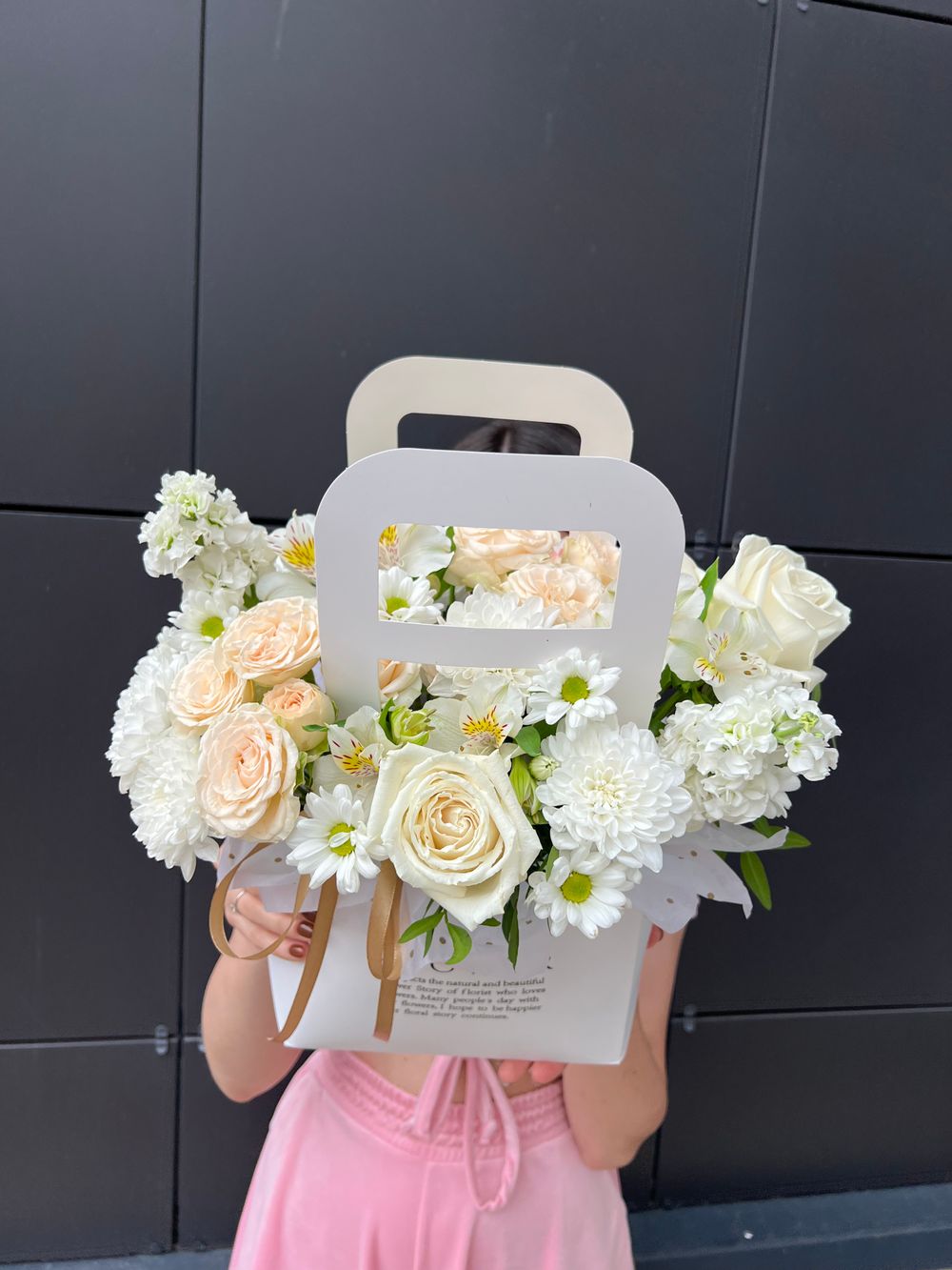 Состав 2 маттиолы, 2 розы, 3 алтстромерии, 1 хризантема, 2 кустовые розы