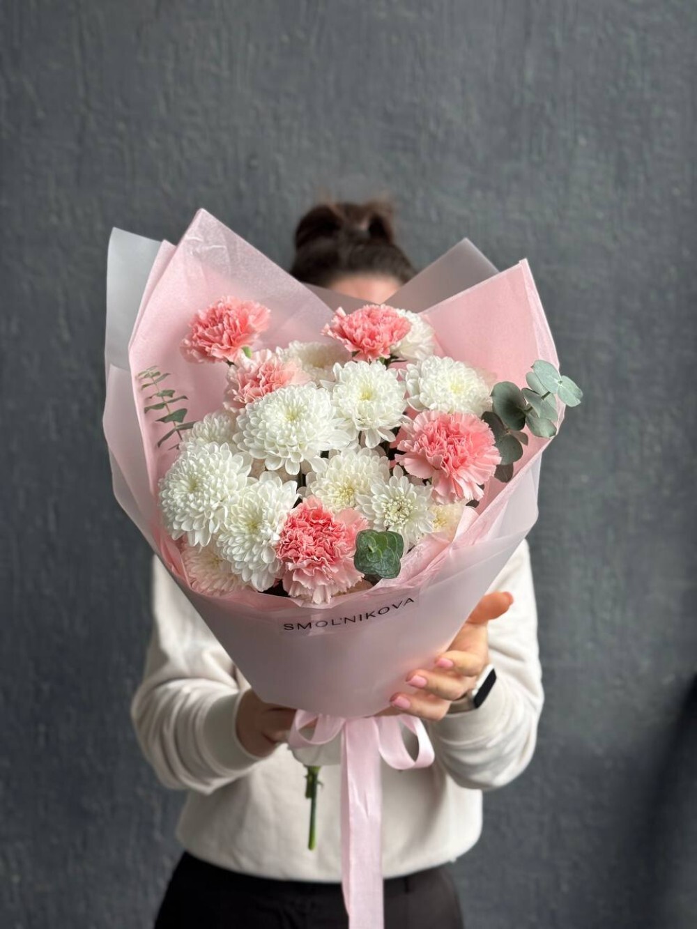 Этот изысканный букет покорит сердце своей утонченностью и гармонией цветов. Белые хризантемы символизируют чистоту и искренность чувств, розовые диантусы добавляют нотку романтики и женственности, а листья эвкалипта придают композиции свежесть и оригинальность. Идеален для поздравления любимой женщины, мамы или подруги по особому случаю или просто так, чтобы подарить радость и хорошее настроение