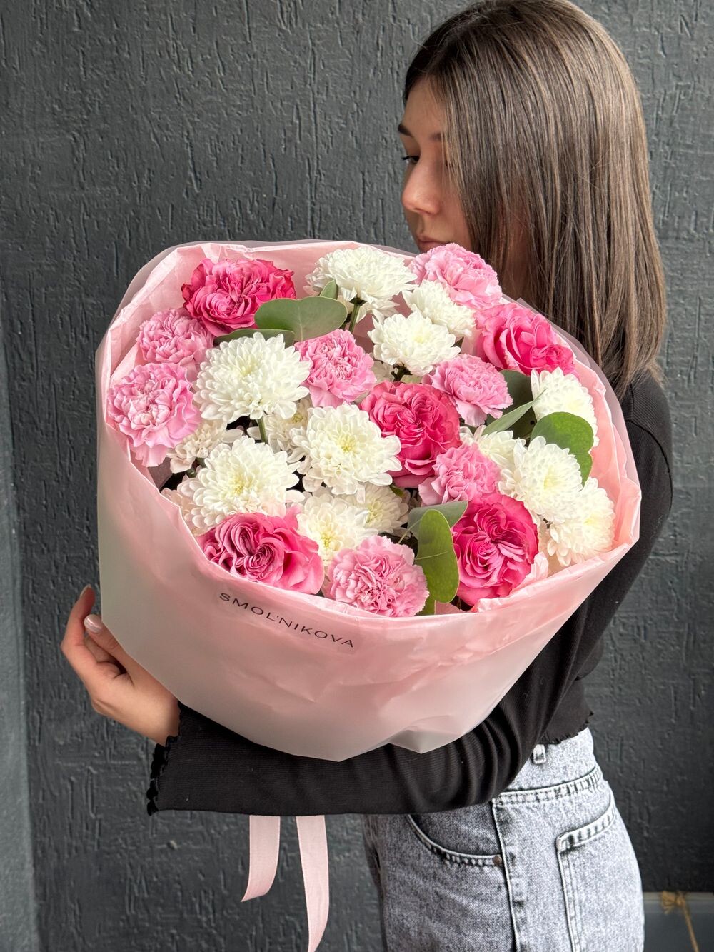 В составе этого шикарного букета 5 пионовидных роз, 7 сортовых диантусов диантусов, 3 большие премиальные белые хризантемы 💕