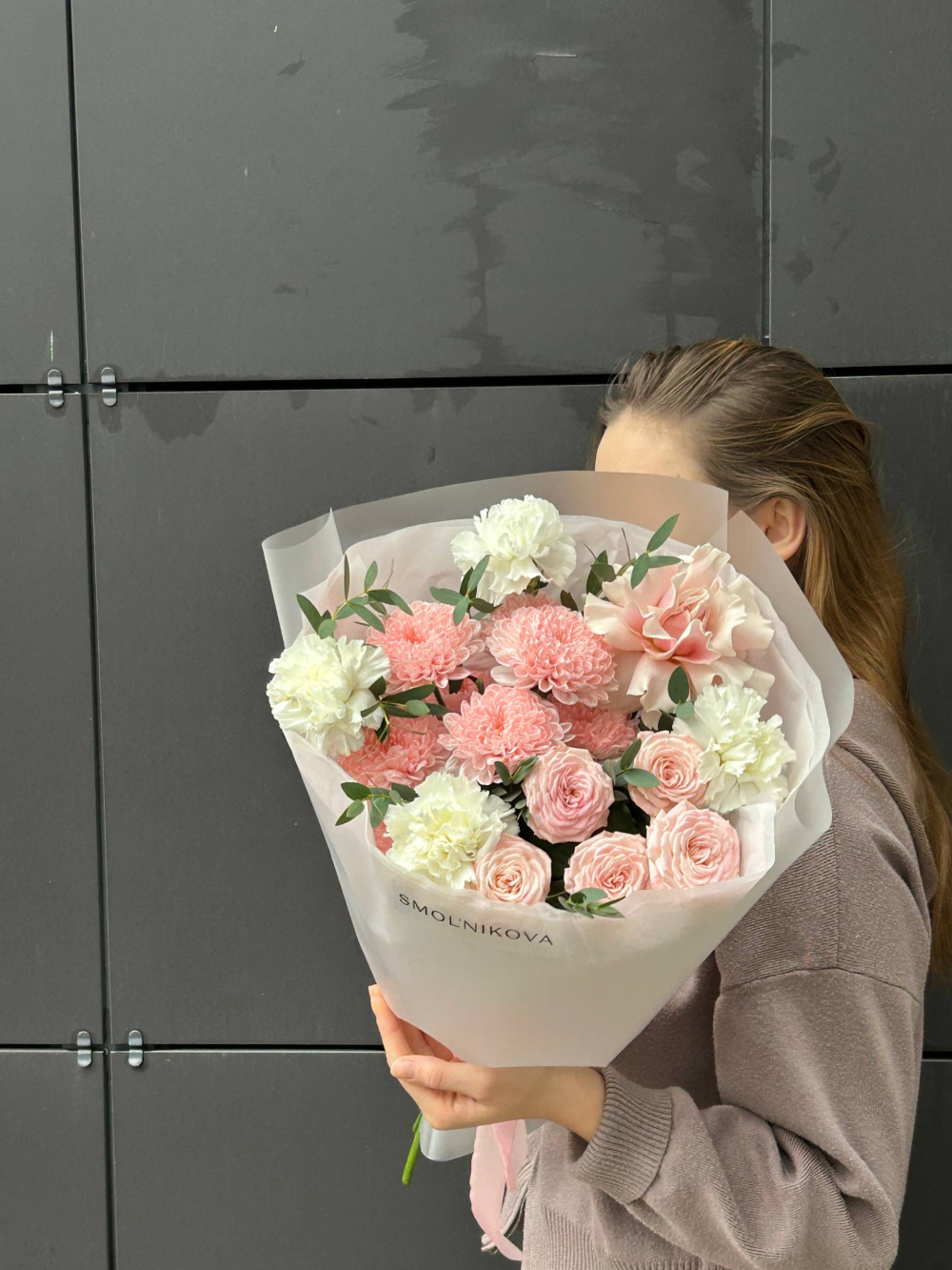 Состав этого нежнейшего букета : диантусы 4шт, роза эквадор 1шт, роза кустовая 1шт, хризантемы кустовые 1шт