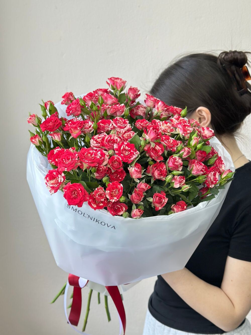 Нежный микс кустовых пионовидных роз с эвкалиптом