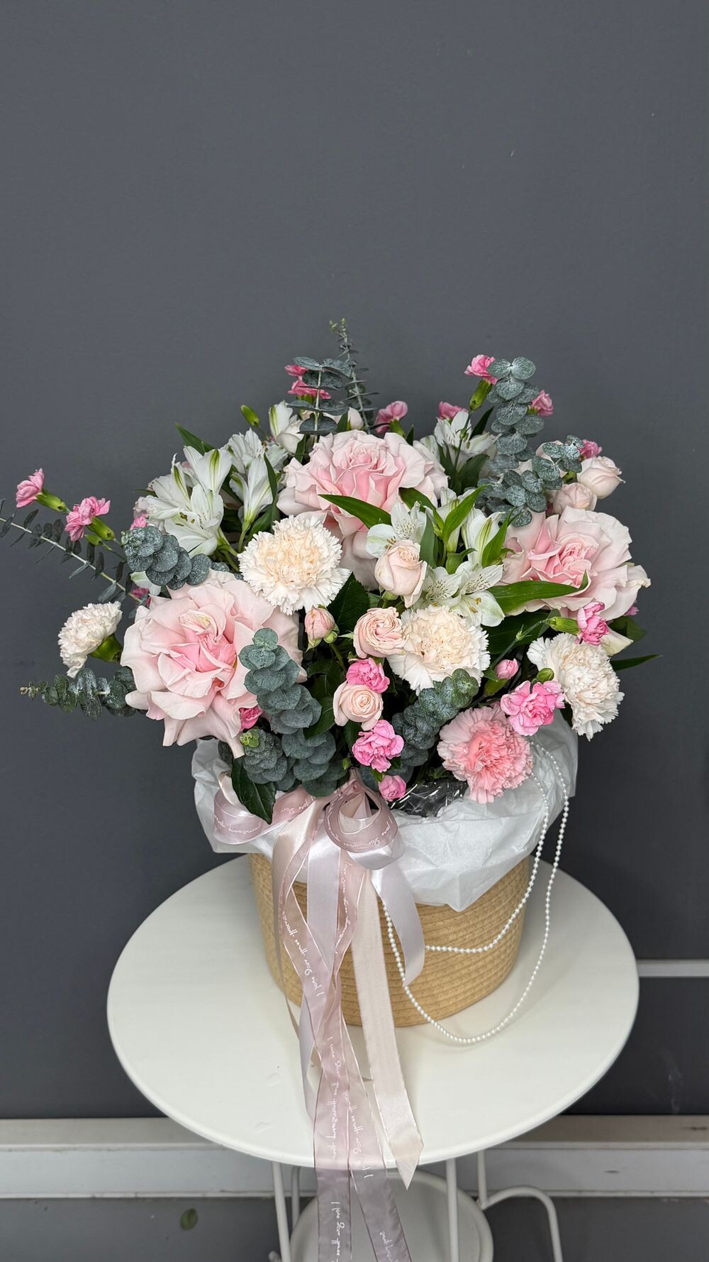 Нежный микс кустовых пионовидных роз с эвкалиптом