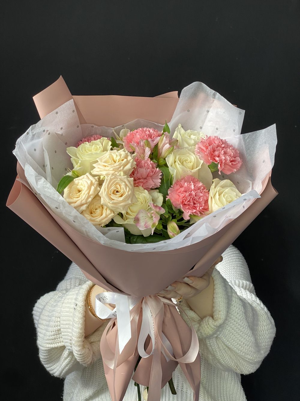 Роскошный букет с головокружительным ароматом! 5 эквадорских роз, 1 премиальная кустовая роза, 5 сортовых диантусов и 3 альстромерии – безупречная композиция для особых моментов.
